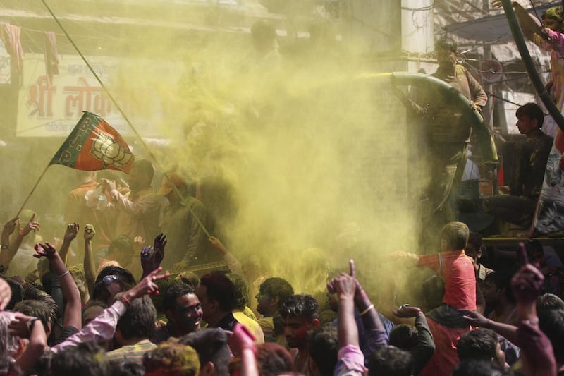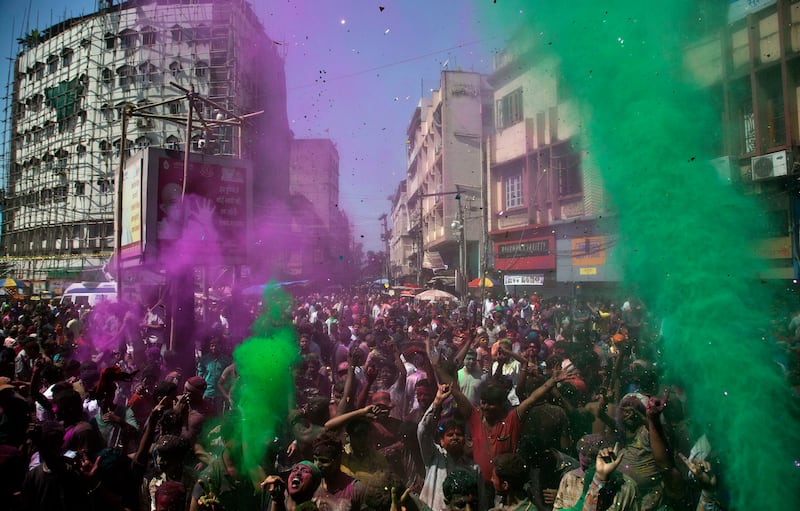 Indians dance as colors are sprayed during the Holi celebrations in Gauhati, India, Monday, March 13, 2017. The festival also heralds the arrival or spring. (AP Photo/ Anupam Nath) | Anupam Nath, Associated Press