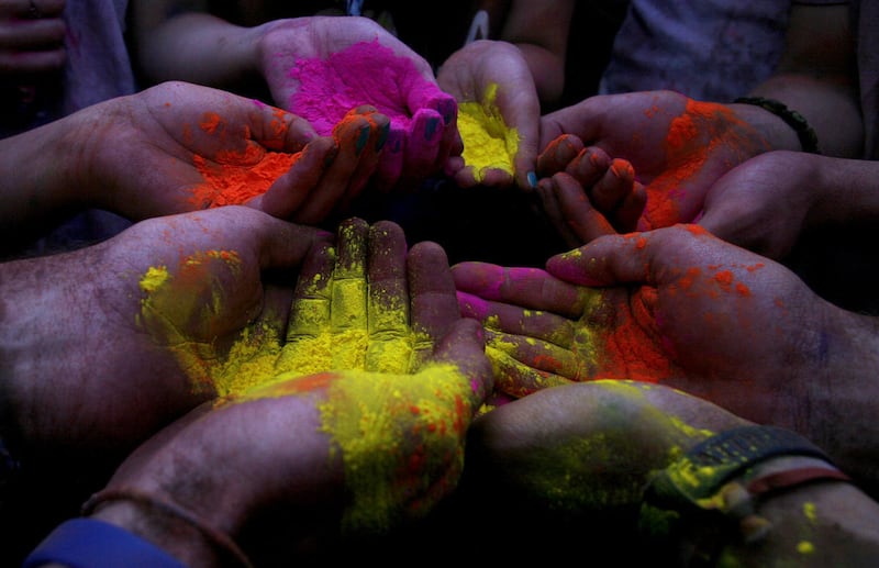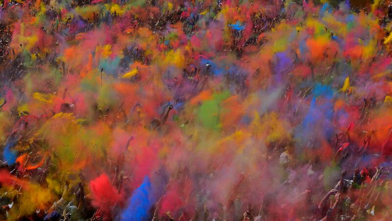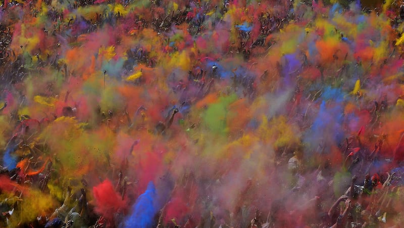 Visitors of the Holi Festival of Colors throw colored powders in the air in Santa Coloma de Gramenet, Spain, Sunday, May 28, 2017. The festival is fashioned after the Hindu spring festival Holi, which is mainly celebrated in the north and east of India. | Manu Fernandez, Associated Press