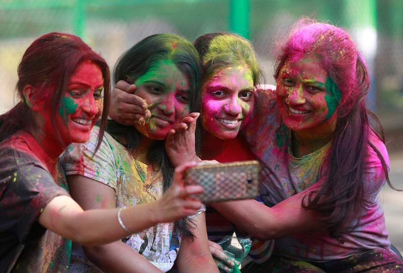 Indian girls take selfie as they celebrate Holi, the Hindu festival of colors, in Mumbai, India, Monday, March 13, 2017. The festival also heralds the arrival of spring. (AP Photo/Rafiq Maqbool) | Rafiq Maqbool, Associated Press