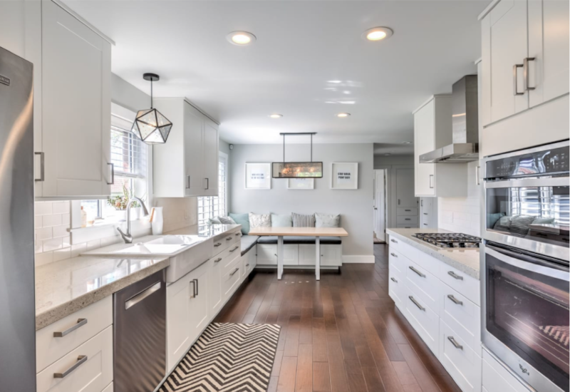 Nothing dates a home more than old lighting. Update with a hip chandelier over the dining table. Replace dated bathroom lights with a new, modern light bar. And add under- and above-cabinet lights to the kitchen, if you don’t already have them. They’ll go great with the bright, white ceiling.