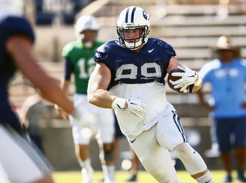 The five tight ends Clark has to work with includes senior Tanner Balderree (6-foot-3, 241 pounds) and junior Hunter Marshall (6-3, 235)— both of whom had a lot of game experience last season, along with converted wideout Moroni Laulu-Pututau (6-4, 230.) Promising freshmen Matt Bushman (6-5, 235) and Bentley Hanshaw (6-6, 225) are also in the mix. That number could expand to six should Joe Tukuafu (6-6, 280) receive clearance to play after deciding to transfer from Utah State.