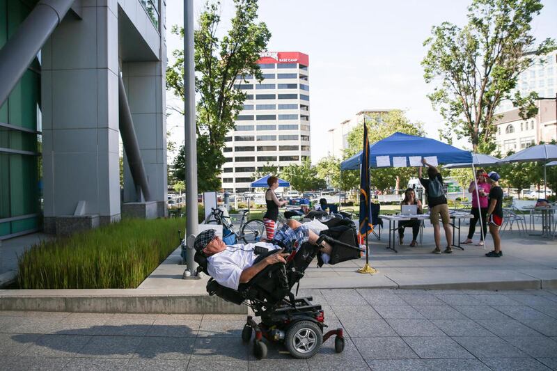About 40 people from Utah Indivisible, Salt Lake Indivisible, Ogden Indivisible, Disabled Rights Action Committee and the Utah Health Policy Project were on hand to call for more restrained fixes to the Affordable Care Act.