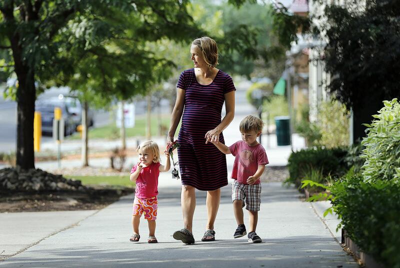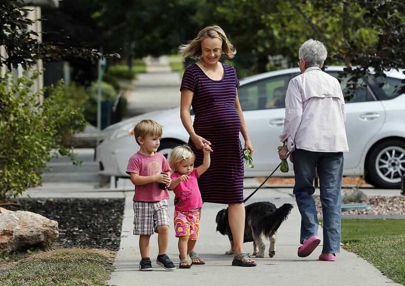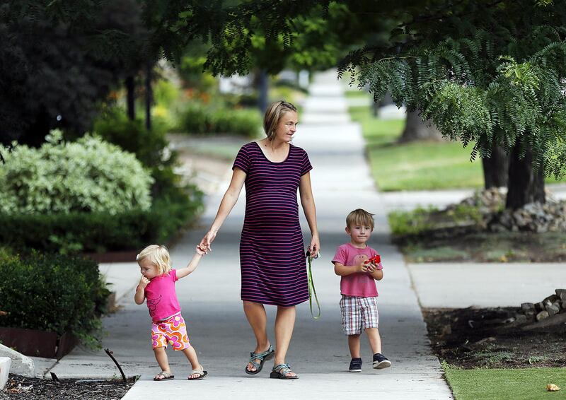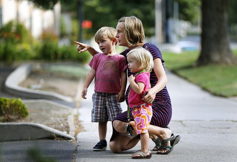 Jeanette Lukens walks with her son Otto and daughter Adeline in Salt Lake City on Tuesday, July 11, 2017. | Ravell Call, Deseret News