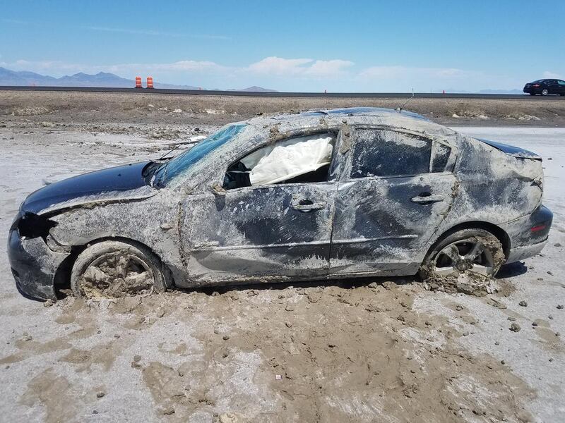 The bizarre incident began about 9:30 a.m. about 19 miles east of Wendover when the UHP was called out to a report of an accident, where a car had over-corrected from drifting into the left side of the road.