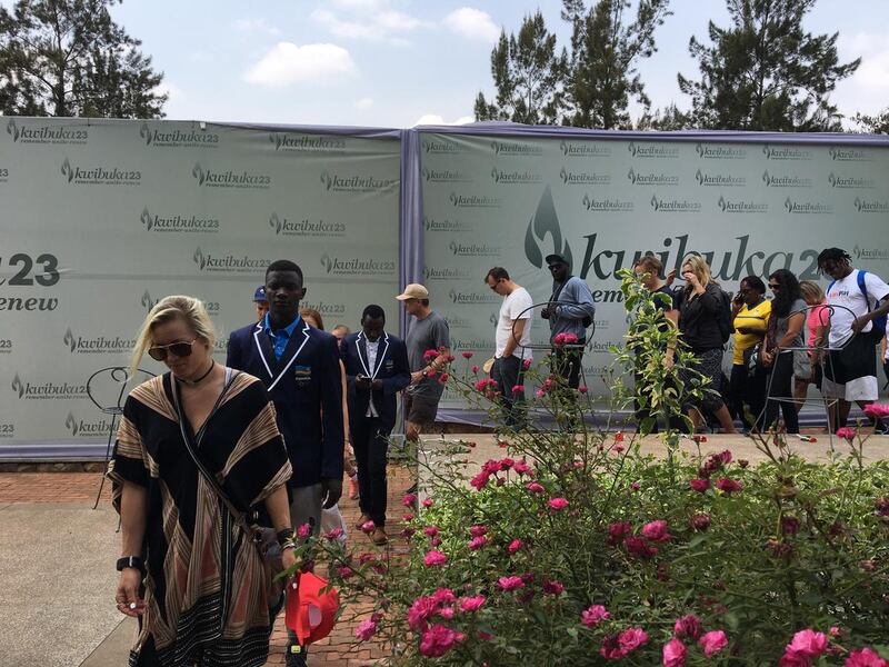 They laid roses adorned with ribbons on the slabs and then offered a few moments of silence to those lost and those still suffering the reverberations of mass killings that touched every aspect of Rwandan life, as well as the surrounding countries.