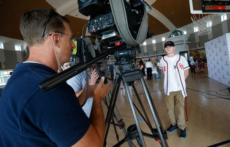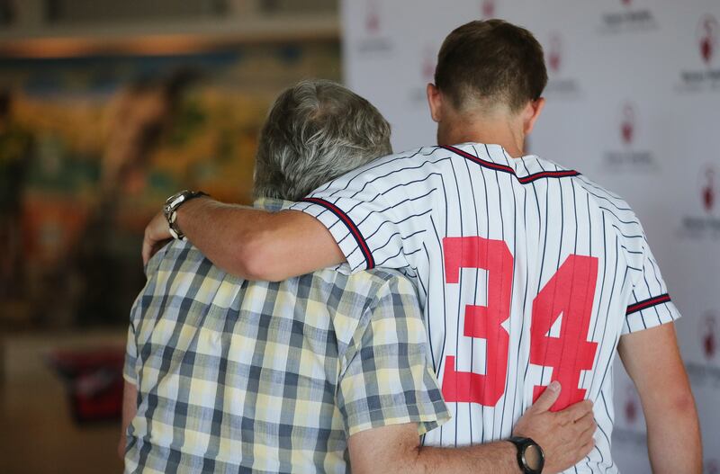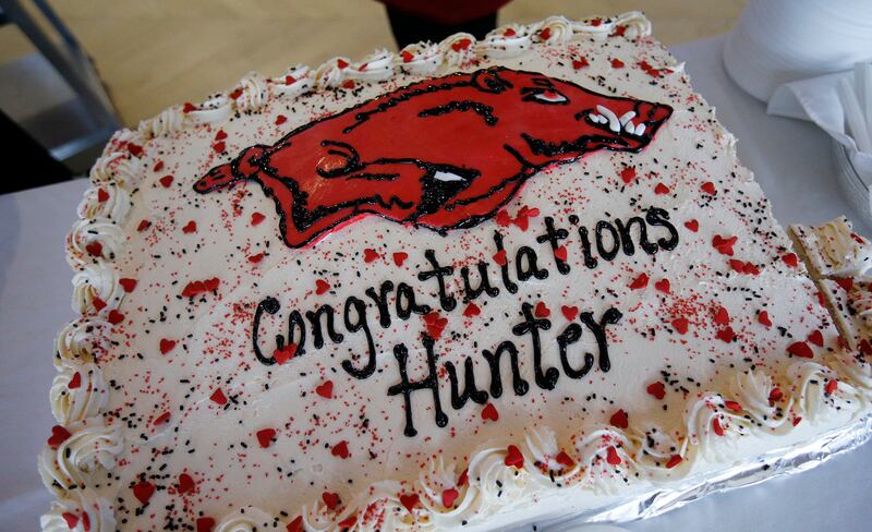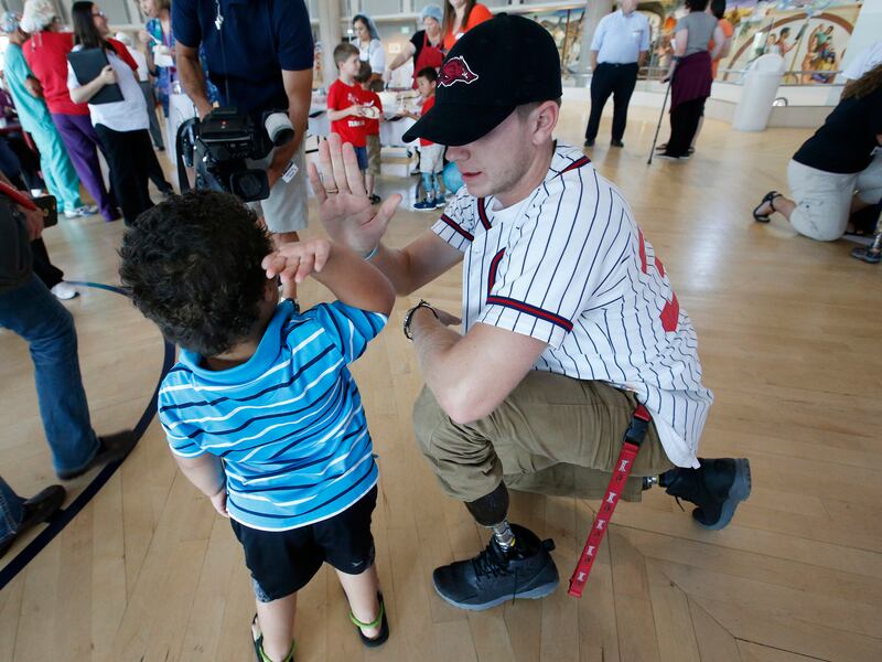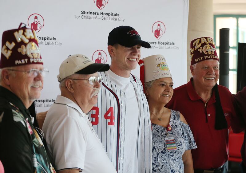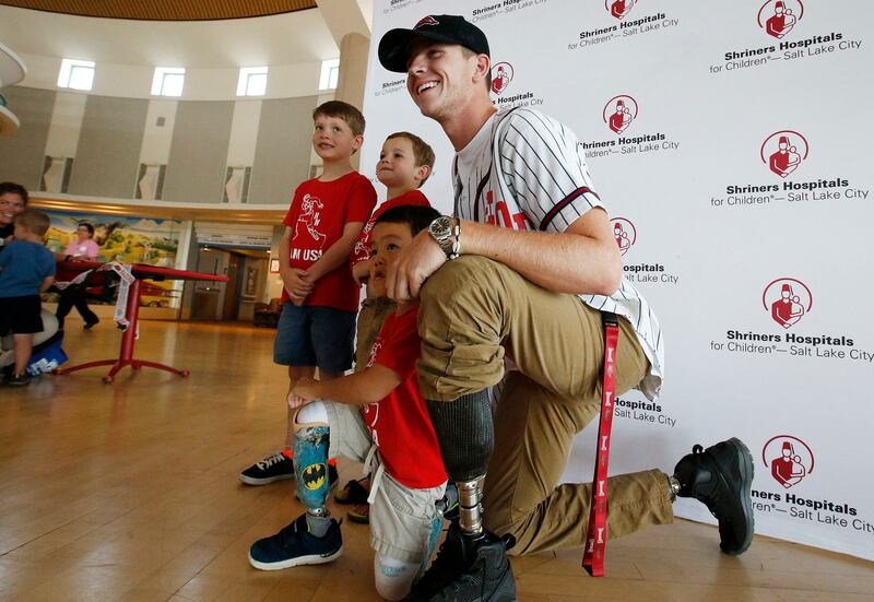 Double amputee track star Hunter Woodhall hugs patient Kadence Joy after he was honored at Shriners Hospitals for Children-Salt Lake City on Thursday. Woodhall, who will leave shortly to attend the University of Arkansas, recently made history as the first double amputee to earn a track and field scholarship at an NCAA Division 1 school. While there, he hopes to continue breaking down barriers for athletes with physical differences throughout his collegiate career. As a patient ambassador for Shriners Hospitals for Children-Salt Lake City, where he has received orthopedic care and customized prosthetic legs since he was a toddler, he has encouraged younger amputees to be proud of their differences and to be open about sharing their story to motivate others. Woodhall compteted at Syracuse High School and at last summer's Paralympics in Rio de Janeiro.