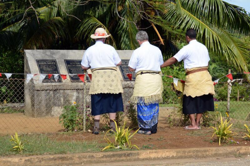 Riley M. Moffat, BYU-Hawaii (left), professor Fred E. Woods, BYU (center), and Kapilon Savou view the historical plaques at the site of the Haalaufuli chapel in Vava'u, Tonga. | Kenneth Mays