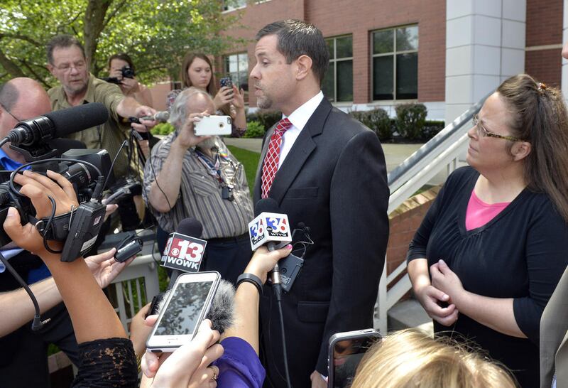 Roger Gannam of Liberty Counsel speaks to the press in July 2015. At the time, he represented Rowan County Clerk Kim Davis, who had said she couldn't issue marriage licenses to same-sex couples because of her religious beliefs. She had been sued by the American Civil Liberties Union. | John Flavell, Associated Press