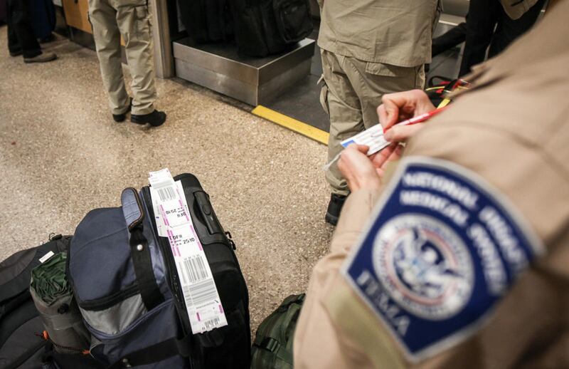 About a dozen members of the team gathered for the same flight out Tuesday morning, while others were scheduled to take later planes. The group, clothed in official khaki uniforms, seemed to be in good spirits as it prepared to leave.