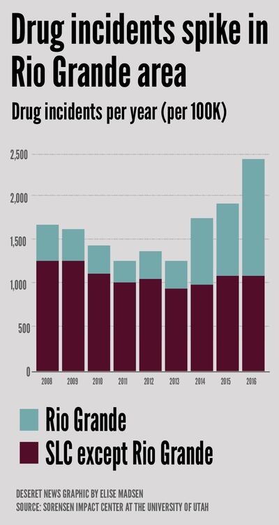 On Aug. 14, the Salt Lake City Police Department, the Unified Police Department and the Utah Department of Public Safety descended on the block in force. During Operation Rio Grande, they made more than 400 arrests, including a handful of " “hardcore drug addicts.”