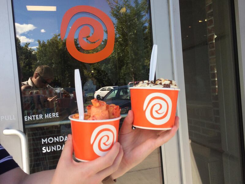 It starts with the liquid base flavor of your choice — the choices the day I went in were vanilla, chocolate, mango and orange — that is poured onto a metal plate that is cooled to -15 degrees, according to Roll With It’s website. As the liquid starts to solidify, the mixins are dumped on top, kneaded into the base and chopped into small bits and blended using two ice cream spades. Once the base reaches the consistency of ice cream, it is spread out into a thin layer on the cold surface and scraped off, creating ice cream that rolls along the way.