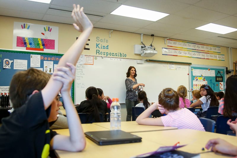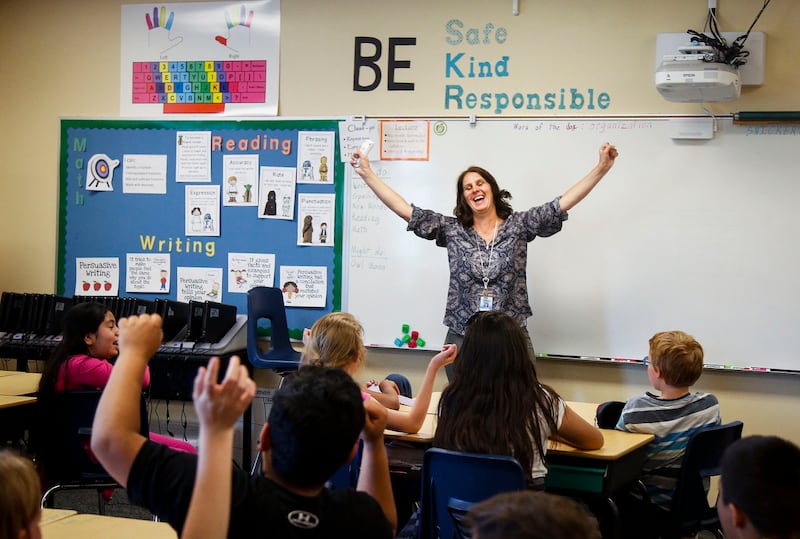 Lynette Schiess, counselor at JR Smith Elementary School, teaches Karen Edward's fourth-grade class about testing techniques as a part pf her Crayons to College program in Heber on Thursday, April 13, 2017. | Nicole Boliaux, Deseret News