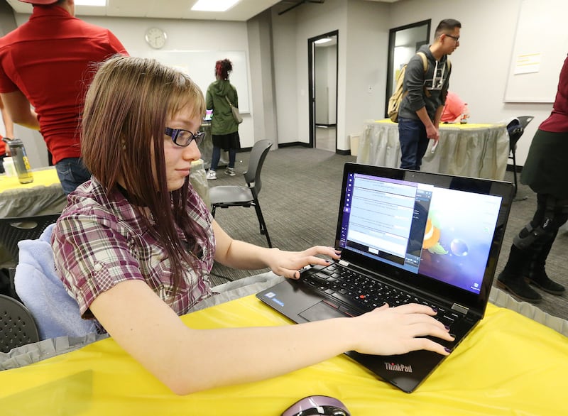 Neumont University student Samantha Waugh looks over her project at the school in Salt Lake City on March 10, 2017. Students were competing for prizes in gaming, non-gaming, Capstone, and Enterprise project categories. | Jeffrey D. Allred, Deseret News