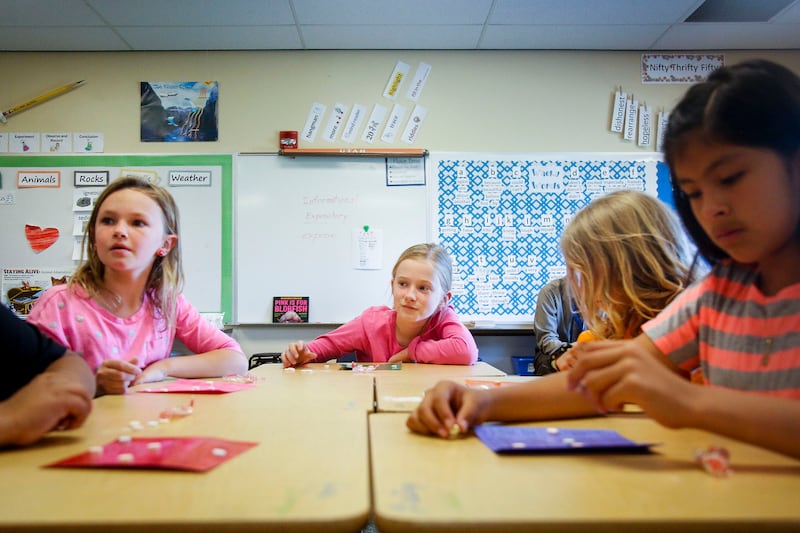 Karen Edward's fourth-grade class plays Smarty Pants Bingo with Lynette Schiess, counselor at JR Smith Elementary School, as a part pf her Crayons to College program in Heber on Thursday, April 13, 2017.. | Nicole Boliaux, Deseret News