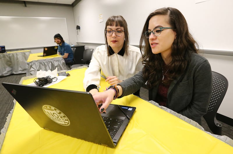 Neumont University students Emily Parr and Maddy Richard look over their project at the school in Salt Lake City on March 10, 2017. | Jeffrey D. Allred, Deseret News