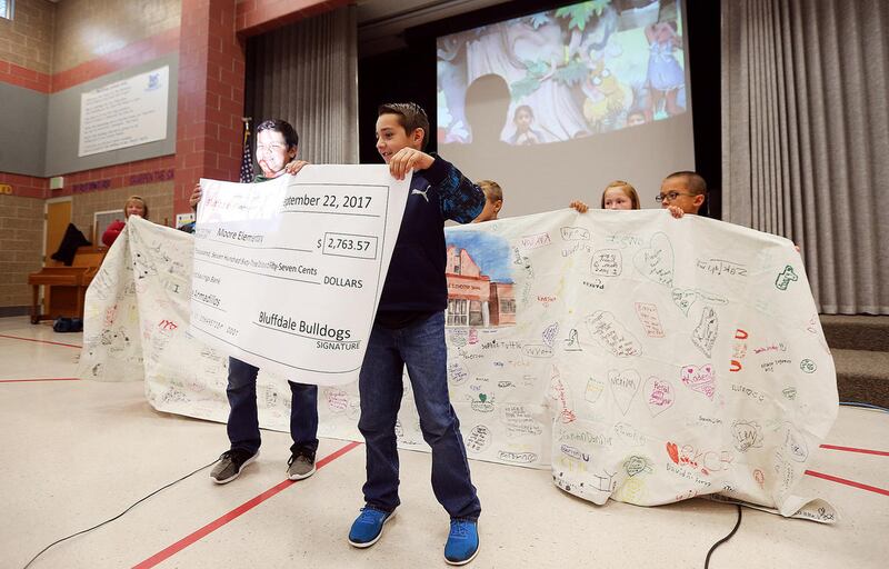 During the Friday morning call, the students of Martianne White's fourth-grade class presented a check for $2,763.57 to Moore's students.