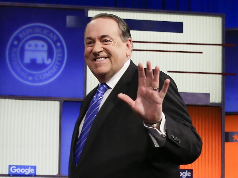 In this Jan. 28, 2016, photo, former Arkansas Gov. Mike Huckabee walks onto the stage before a Republican presidential primary debate in Des Moines, Iowa. | Charlie Neibergall, AP