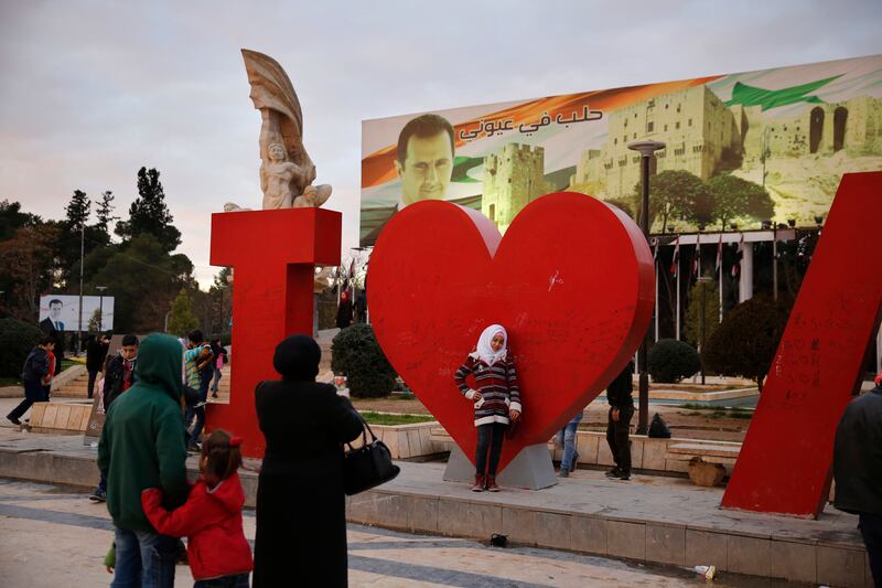 ALEPPO, Syria — Aleppo's largest square was packed with people of all ages: young men performing a folk dance, children playing, others buying ice cream, popcorn, peanuts and salted pumpkin seeds. A giant sign spelled out in colorful English letters, "I love Aleppo."