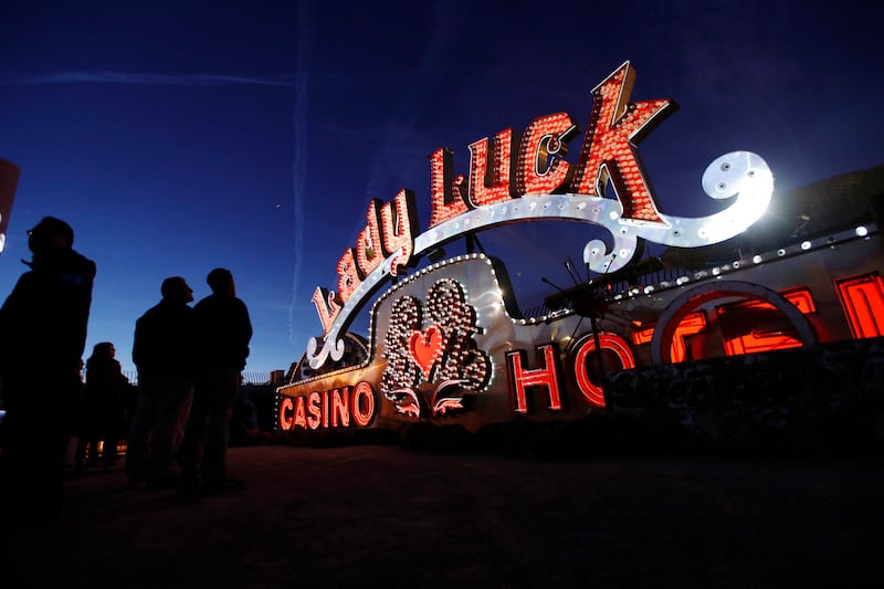 LAS VEGAS — As Frank Sinatra asks Lady Luck to stick around, the neon red lights of one of Las Vegas' most famous towering signs appear to dance under the night sky, revealing a beating heart and the rest of the marquee of a famed casino-hotel. Other rusted, dusted and broken neon signs in a large gravel lot ringed by a security wall appear to light up with neon not seen for decades as other classic tunes play in the background.