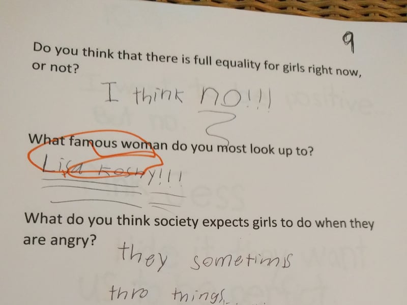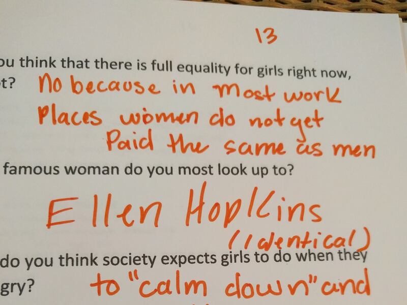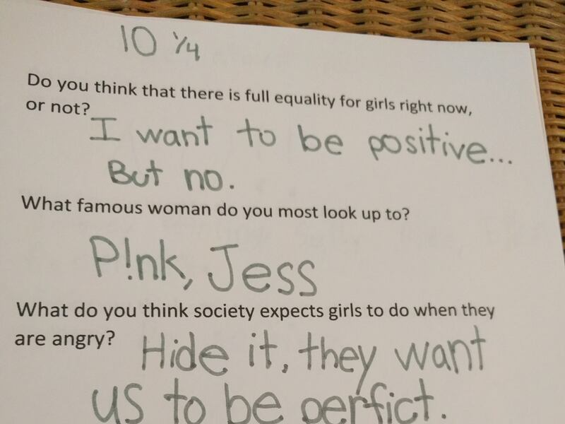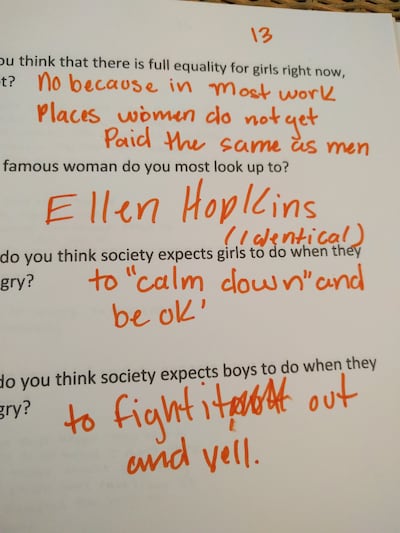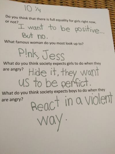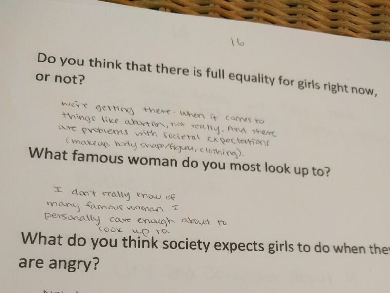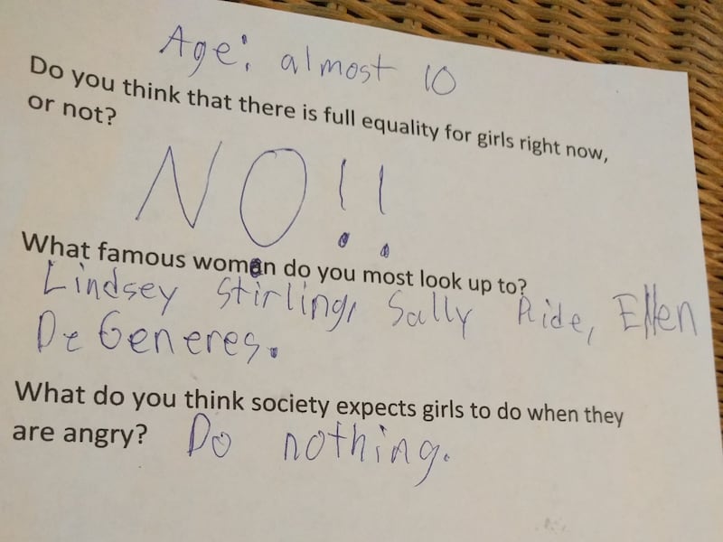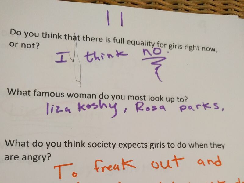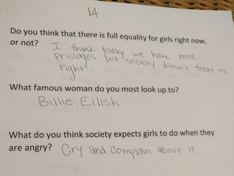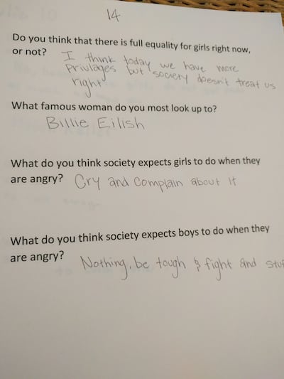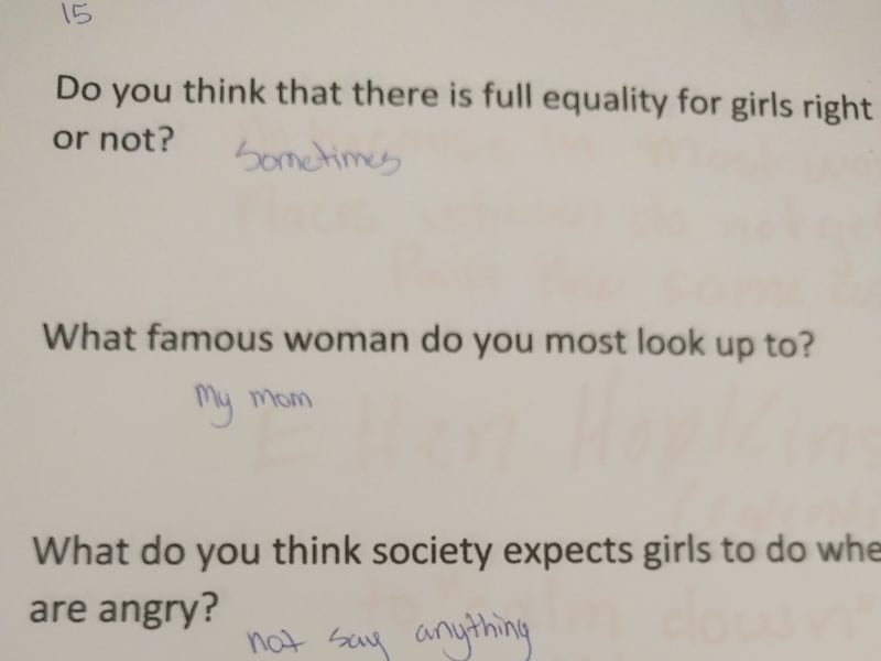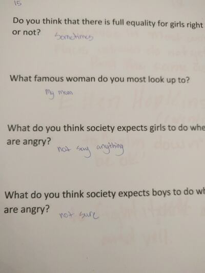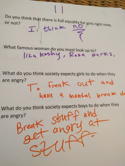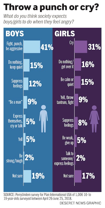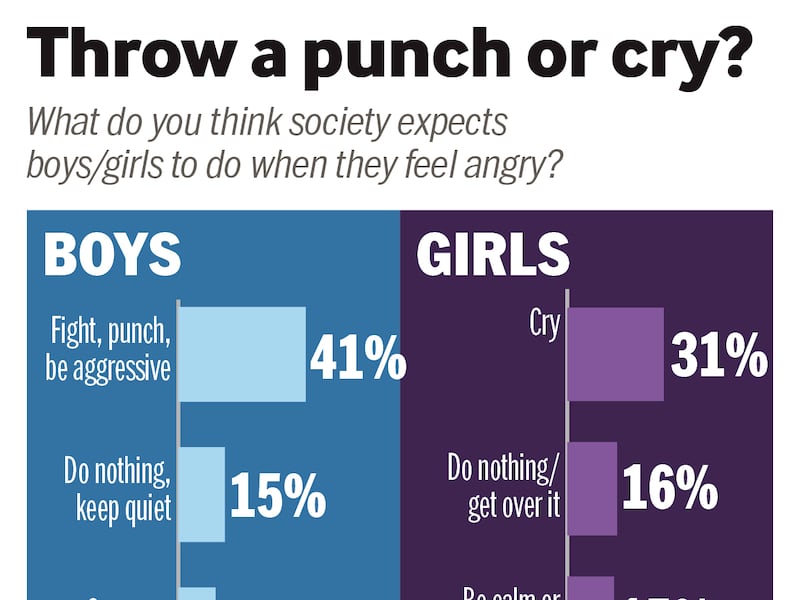 Asked what society expects a woman to do when angry, a 13-year-old said, "to calm down and be OK." Asked what society expects a man to do when angry, the teen replied, "to fight it out and yell."
