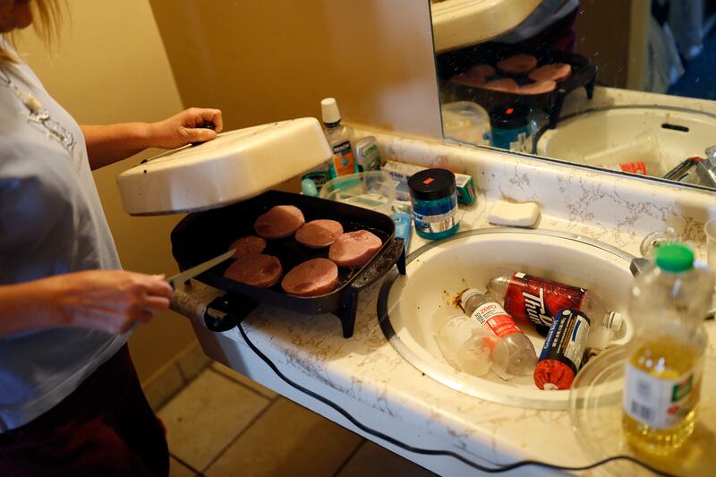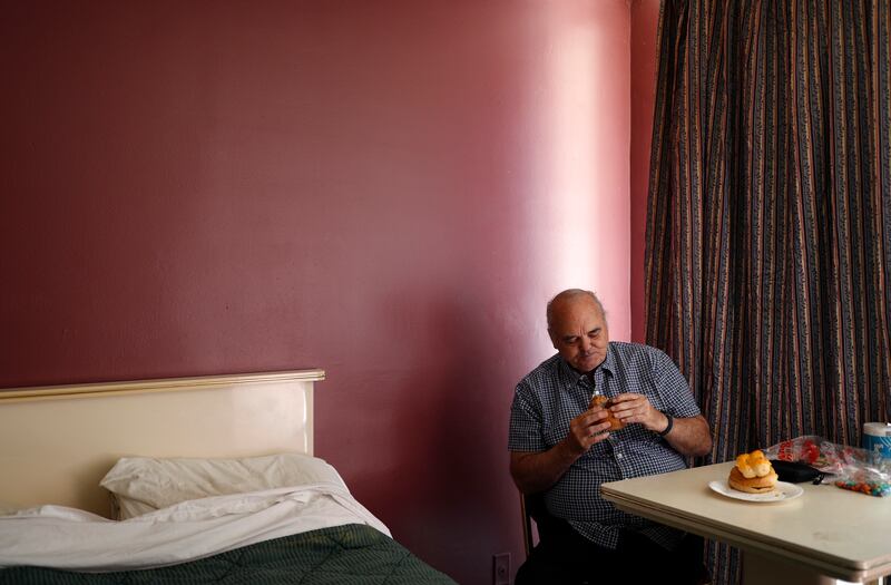 He and his partner pay $850 a month for a small studio in the Fireside Inn, cooking food they get at a pantry on a small portable skillet they place next to the bathroom sink. Both are thankful they are no longer on the streets but say many of their neighbors are senior citizens or the disabled who are on fixed incomes and just one rent increase away from homelessness.