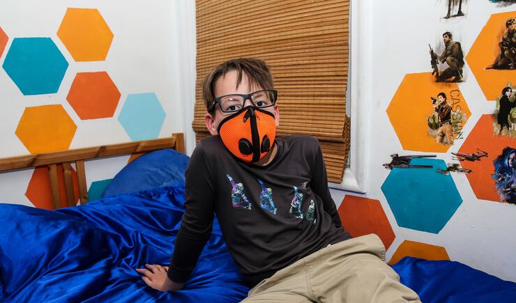 It’s a black mouth and nose covering that he wears on bad air days, with an activated charcoal filter and one-way valves, so breath goes out and clean air comes in.