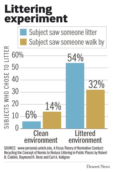 A 1990 experiment, conducted by psychologist Robert Cialdini of Arizona State University and colleagues, showed that people were more likely to litter after they saw someone else throw a paper flier on the ground in a polluted environment. But when they saw someone throw a flier on the ground in a clean environment, they were less likely to follow suit. The behavior stood out and was therefore easier to disapprove of.