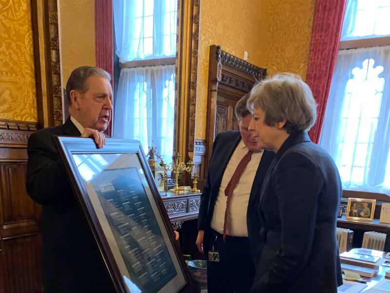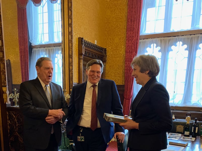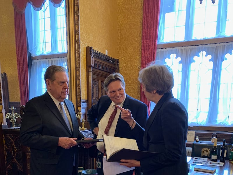 After a lunch with a dozen members of Parliament, he then spent 15 minutes with May in her office at the Palace of Westminster, presenting her with bound copies of her family history in her office before she flew to Brussels for additional critical negotiations about Brexit, her nation's planned exit from the European Union.
