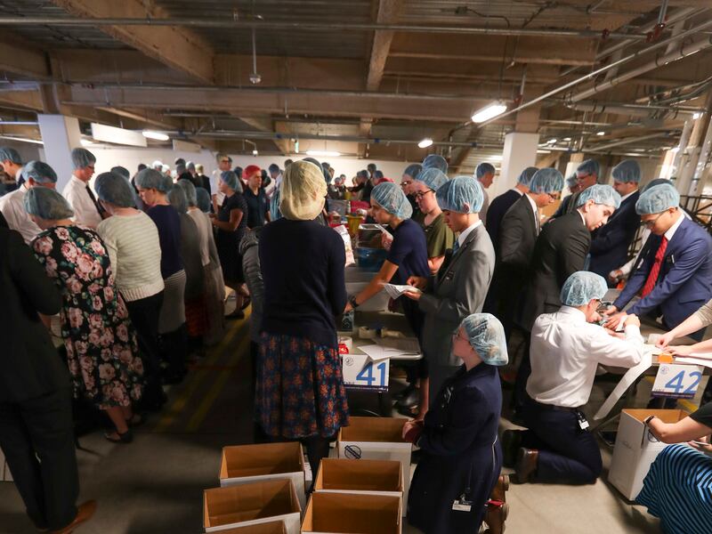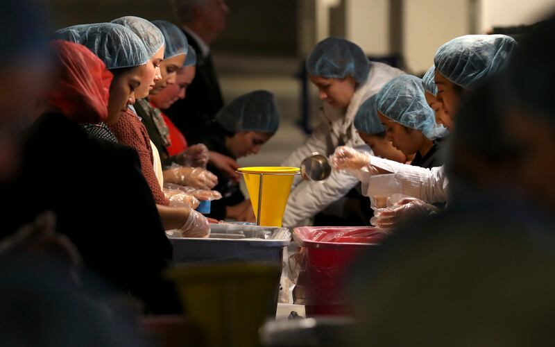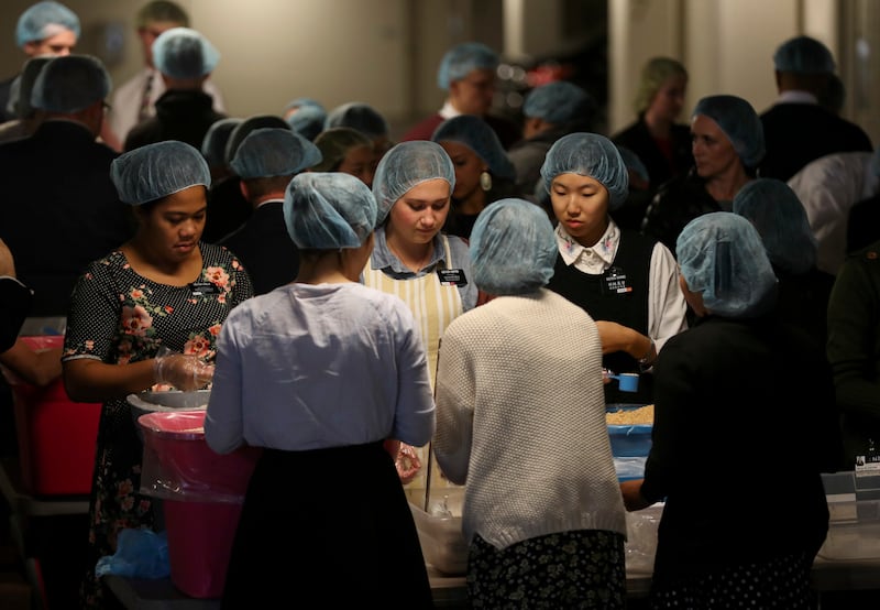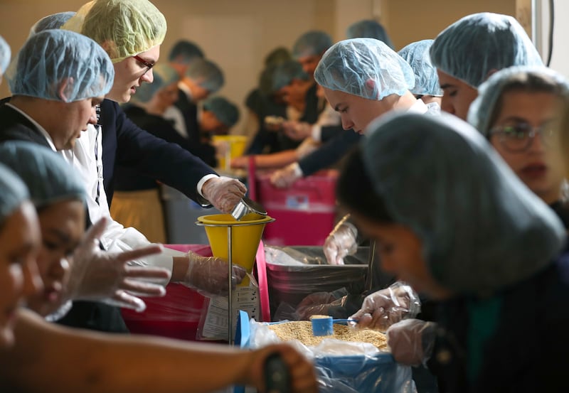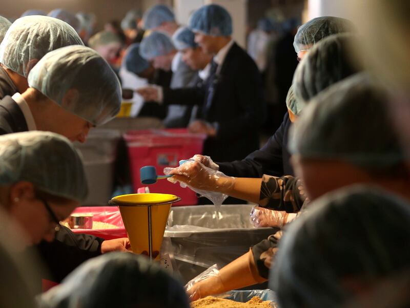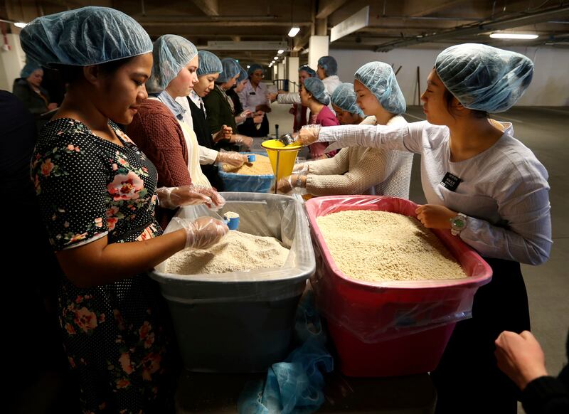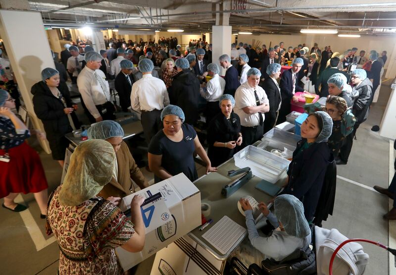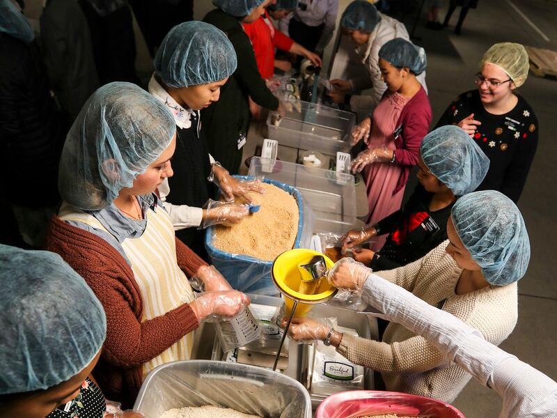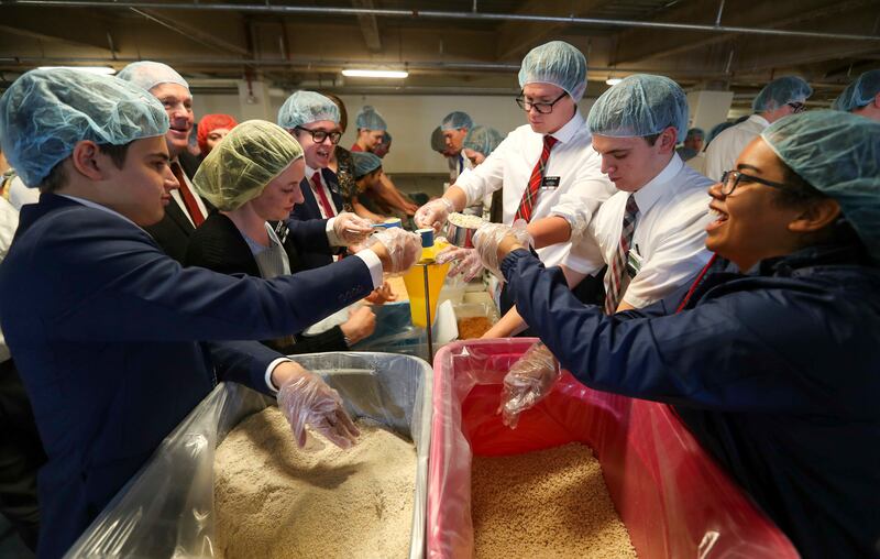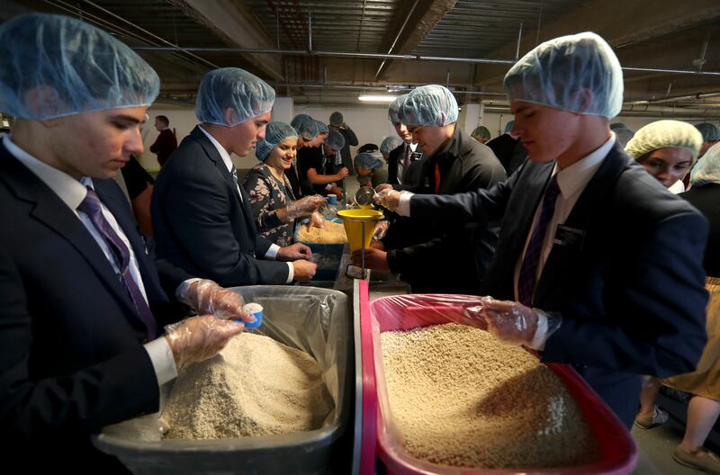 On Thursday, the mostly reverent, but large crowd of young adults donning shiny black nametags filled more than 350,000 specially marked plastic bags with carefully measured puffed brown rice, oatmeal, dried apples and nutmeg.