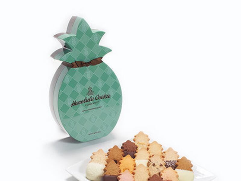 Premium shortbread cookies by Honolulu Cookie Company in pineapple-shaped cookie box that includes dark triple chocolate macadamia, guava, coconut, passion fruit and many other flavors. $25.95