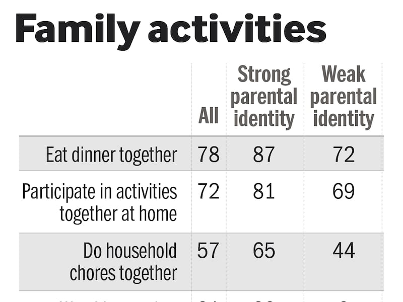 Those with strong parental identities were more apt to report they worship as a family, argue with each other, go out together and attend activities of other family members. Eating dinner and doing activities together at home were common among respondents, but proportions are higher for those with stronger family identities than for those with weaker ones.
