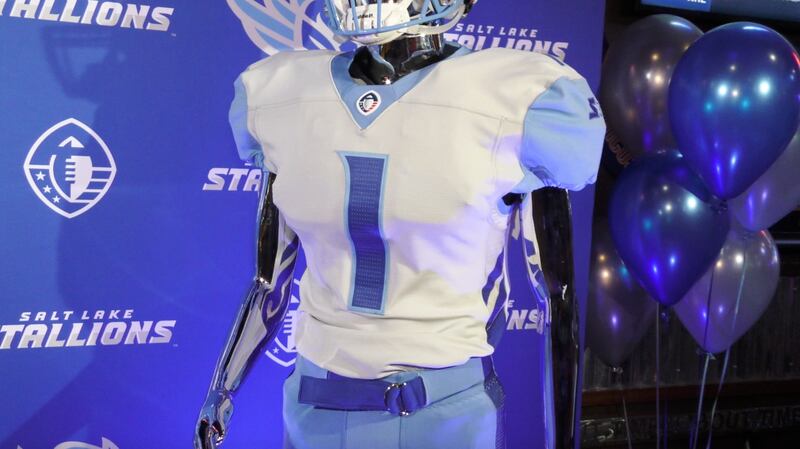 The Stallions’ uniform colors — sky blue, royal blue and silver — mirror those of the team logo and name released in late September. Those colors “are inspired by the reflection of the vast blue sky off of the Great Salt Lake and the silver tips of the Wasatch Mountains,” the Alliance said in a press release. “The logo is inspired by car hood ornaments and automotive indicia that adorns some of history’s fastest and most famous cars.”