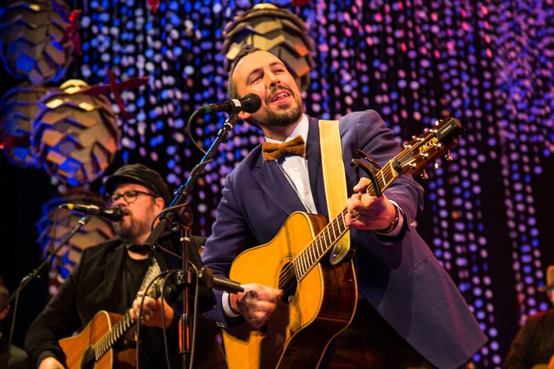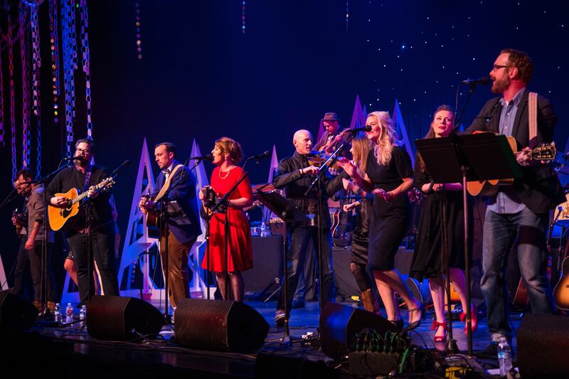 In December, the large group of friends and musicians wrap up their shows by gathering together around a single guitar and inviting the audience to sing along with them to “Silent Night.”