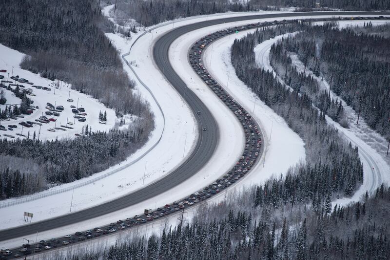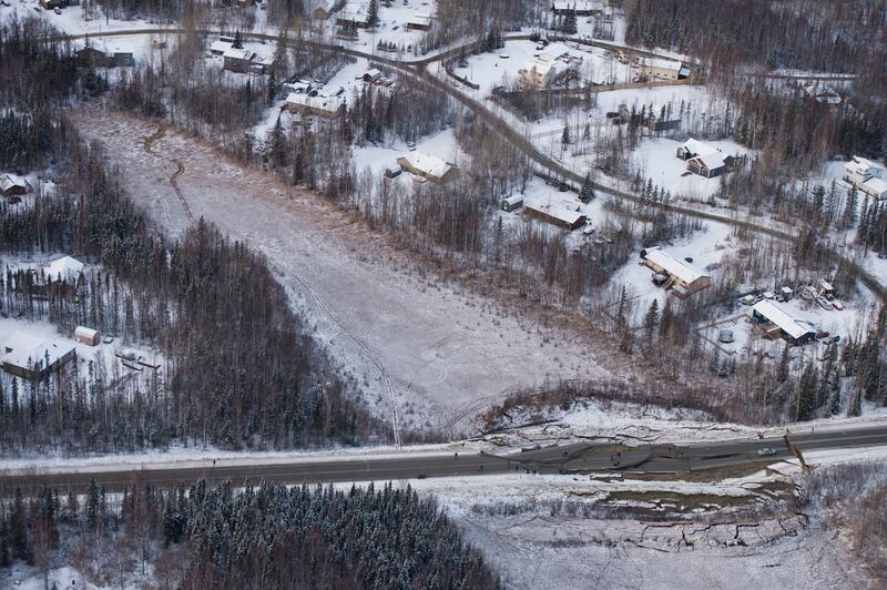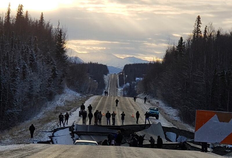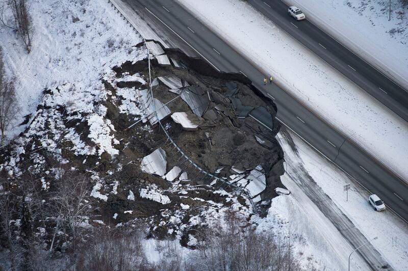 Anchorage Police Chief Justin Doll said he had been told that parts of Glenn Highway, a scenic route that runs northeast out of the city past farms, mountains and glaciers, had "completely disappeared." Traffic in the three lanes heading out of the city was bumper-to-bumper and all but stopped Friday afternoon as emergency vehicles passed on the shoulder.