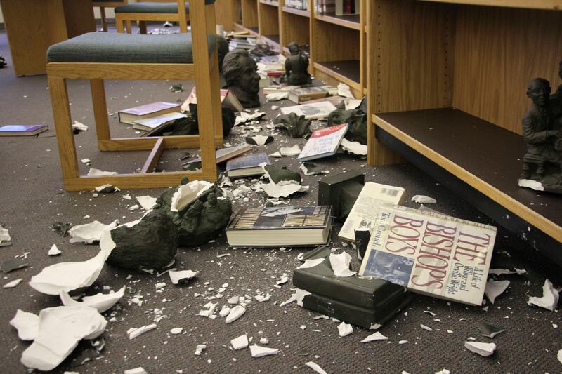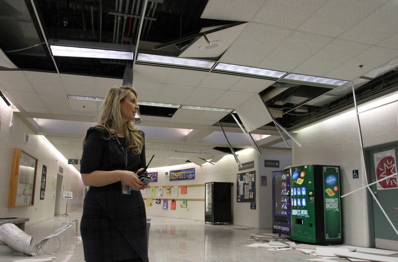 At Chugiak High School, acting principal Allison Susel said ceiling tiles came down, books and other items fell from shelves, and water line breaks caused damage.