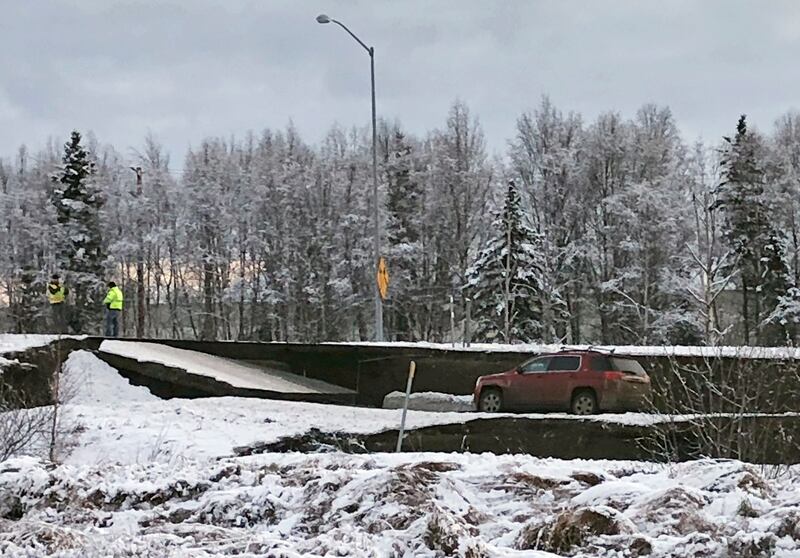 A large section of an off-ramp near the Anchorage airport collapsed, marooning a car on a narrow island of pavement surrounded by deep chasms in the concrete. Several cars crashed at a major intersection in Wasilla, north of Anchorage, during the shaking.