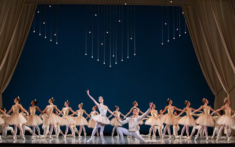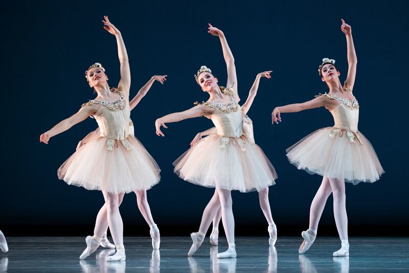 The evening ended on a high note in a spectacle of imperial Russian grandeur complete with a massive, zigzagging corps, Peter Tchaikovsky’s Third Symphony, glittering ivory costumes and a romantic pas de deux with Emily Adams and Adrian Fry (Friday cast) as the central ballerina and her cavalier in "Diamonds."