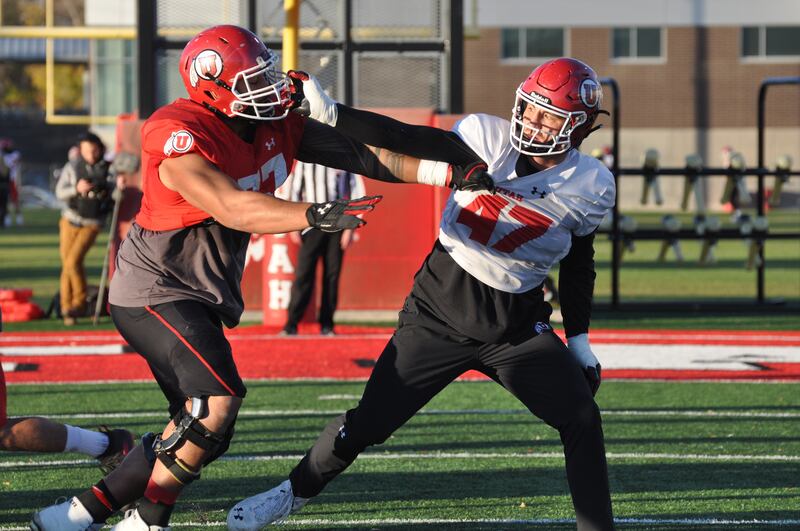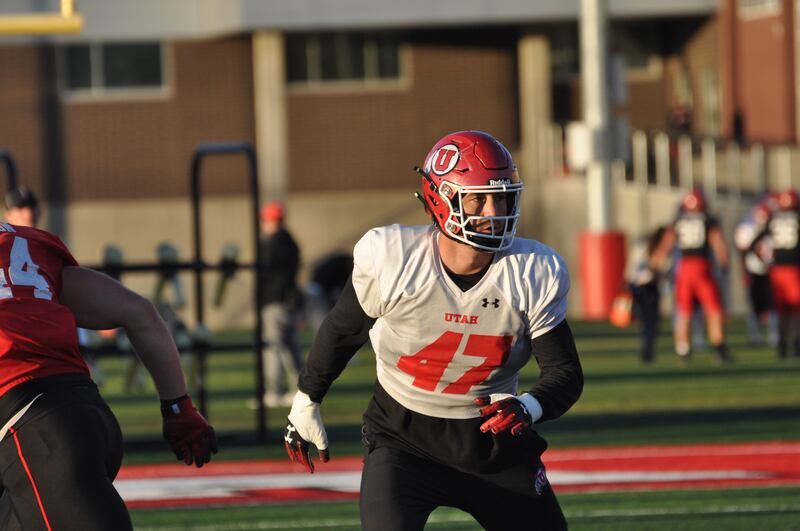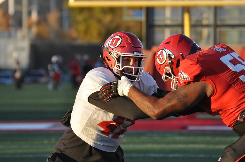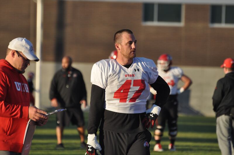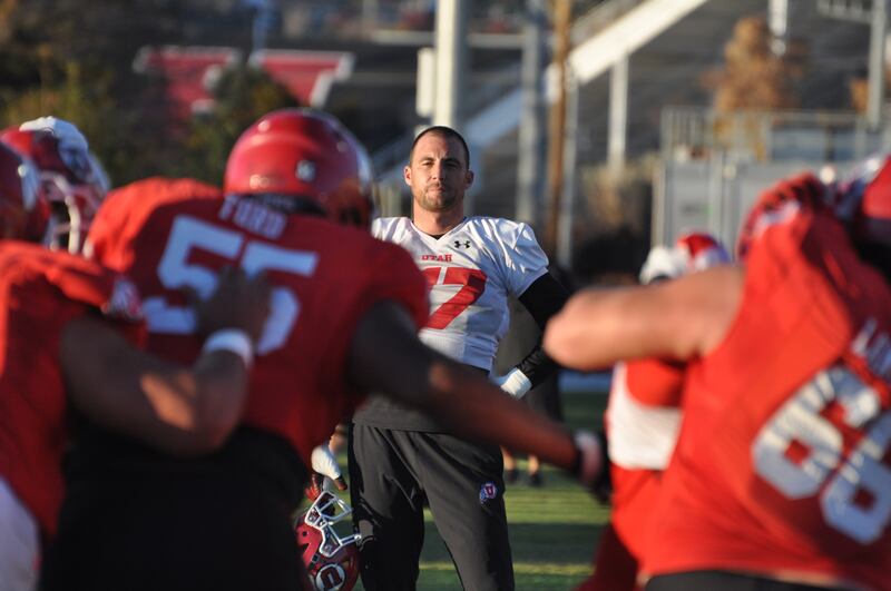 He’s still training daily, and twice a week he joins the Ute practices. On Tuesday, he not only coached the offensive line, he put on pads and mixed it up with Utah’s starting offense, a 30-year-old man among kids. He plays inside and outside linebacker, defensive end, even safety.