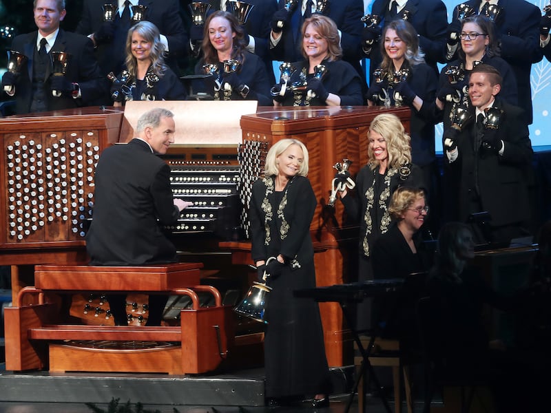 And as choir president Ron Jarrett promised at the press conference earlier this week, Tabernacle organist Richard Elliott delivered a dynamic organ performance — and his own arrangement — of “Carol of the Bells.” But just as his footwork and fingerwork was picking up speed, Chenoweth arrived yet again for another scene-stealing moment: She finally got the chance to ring that big bell she’d always dreamed of ringing. Elliott kindly took a short pause to let Chenoweth bask in her glory.