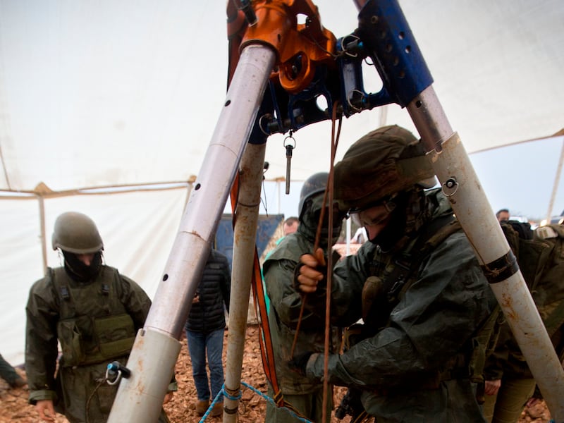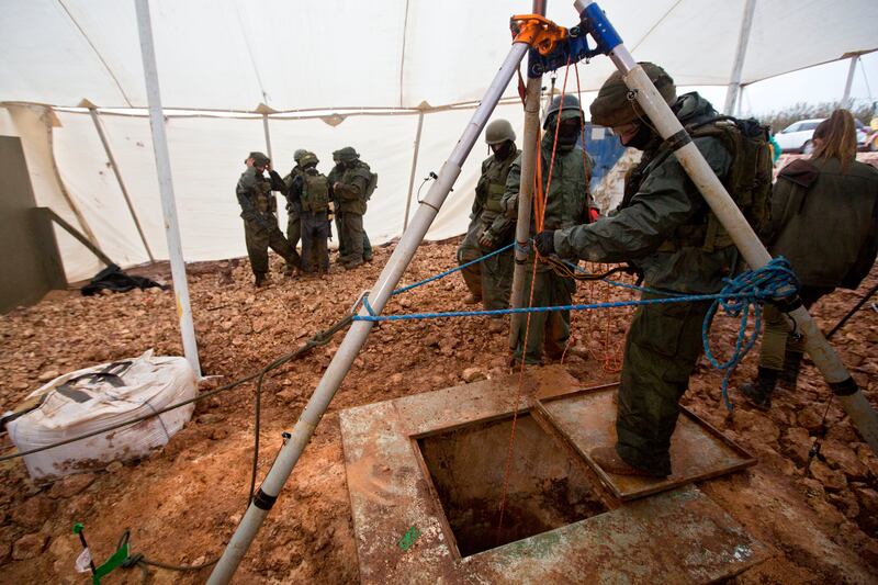 On Wednesday, the Israeli military escorted reporters along the Israel-Lebanon border to the site of one of the tunnels found in recent weeks near the town of Metula. Heavy mist and rain nearly obscured the Lebanese villas perched on the mountains overlooking Israeli army bulldozers and tractors trundling through the mud.