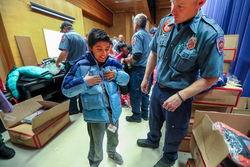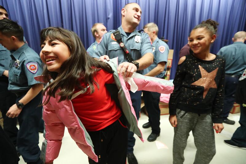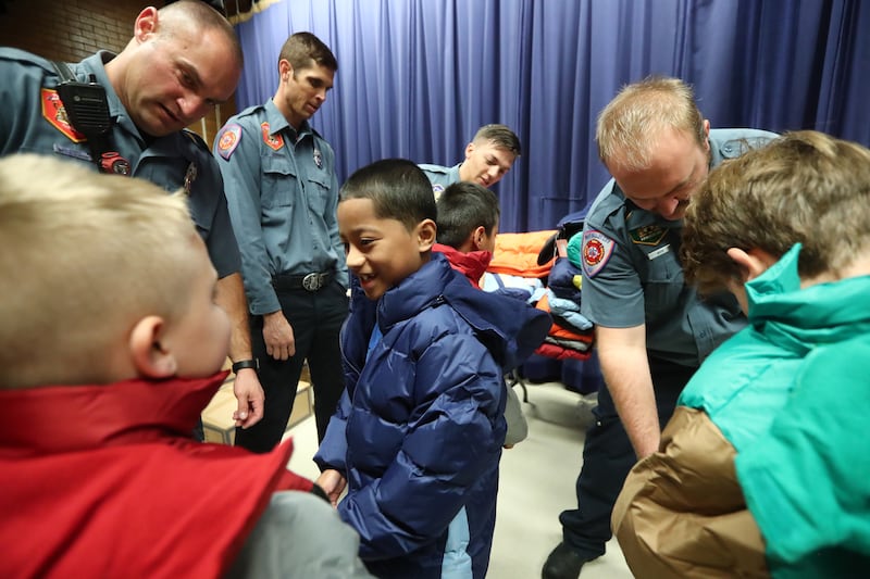 Nearly 150 students lined up for a turn to pick out a brand new coat, with the help of about 20 delighted firefighters, as part of Operation Warm, a nationwide charity that gives coats to children who may not have them.