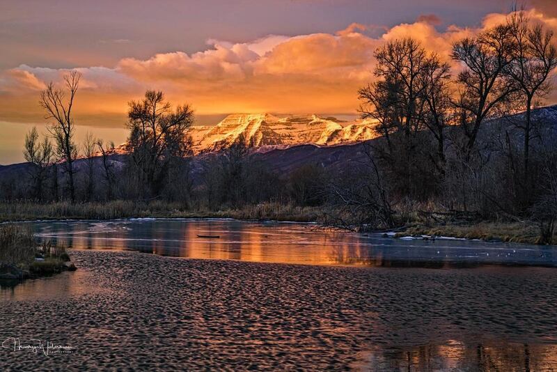 The skies on this mild winter morning looked like they might be spectacular so I hurried to a favorite trail along the Provo River. I'd hiked about a mile in when the sunrise lit up the clouds above Mount Timpanogos in a fiery blanket of gold that was reflected in this pond near the river. Moments like these are a gift!