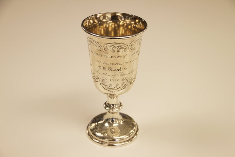 As for the creator of the cup, William Rogers, Fox said, “Rogers was employed as an engraver. He did silver electroplating. Birmingham England in the 1840s was growing in prestige as the origin of the silver electroplating industry. Rogers learned the trade there in his home village and used his skills to personally create the cup for Wheelock.
