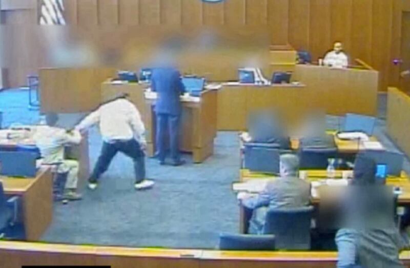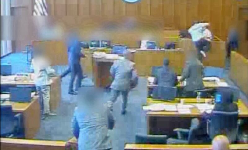 "The video completely contradicts plaintiffs’ argument that Angilau stopped posing a danger within less than one second of launching himself over the witness stand while making a stabbing motion with a pen in hand," Dowdell wrote.