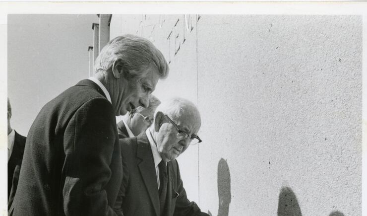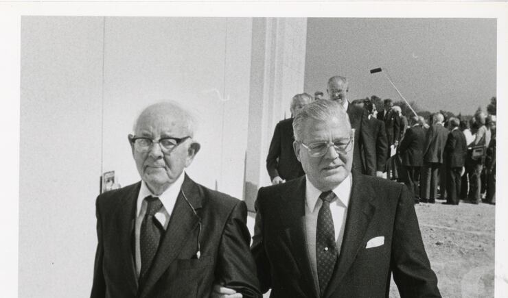 On Feb. 3, 1978, then-LDS Church President Spencer W. Kimball originally announced the Jordan River Temple in a news conference; he helped break ground on June 9, 1979 by operating a a Caterpillar tractor with a large, power-scoop shovel.