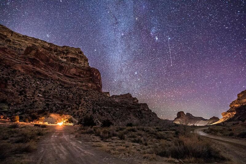 He wrote of that scene, "A campfire burns and illuminates a small area in Buckhorn Wash of the San Rafael Swell, Emery County, Utah. A rare passing car illuminates the hills to the right. The thin winter Milky Way rises in the middle of the image. Crisp air adds to the silence at night, here in the desert. A fast meteor runs along with the Milky Way. Several smaller meteors, unseen here, also fell during this 30 second exposure."
