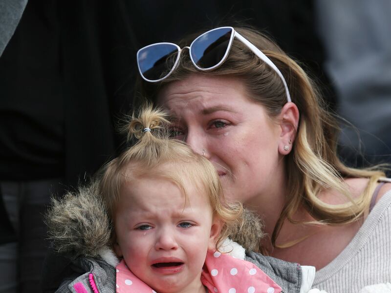 "We try to make this our whole family serving. They have a part to play in this as well. They're sacrificing by having dad away," the father of five explained, holding his teary-eyed young son on his hip. "I don't know if it makes it any easier, but it gives them shared ownership in sacrificing for people that they don't know."