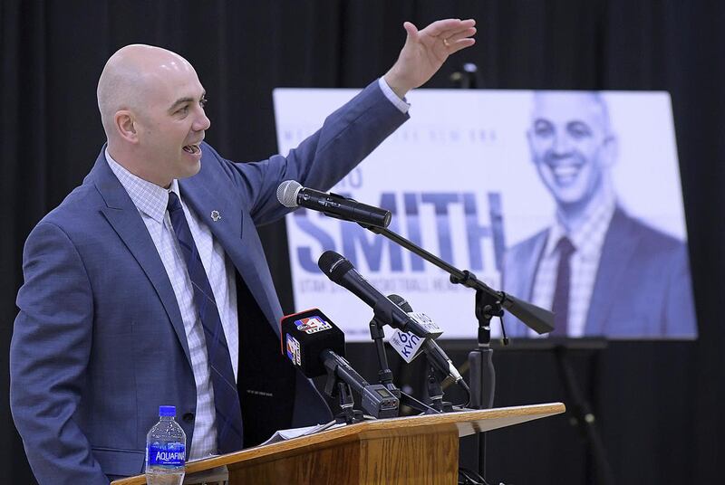 Smith was introduced to Utah State basketball fans by USU President Noelle Cockett and Aggie athletic director John Hartwell Tuesday morning during a press conference at the Wayne Estes Center.