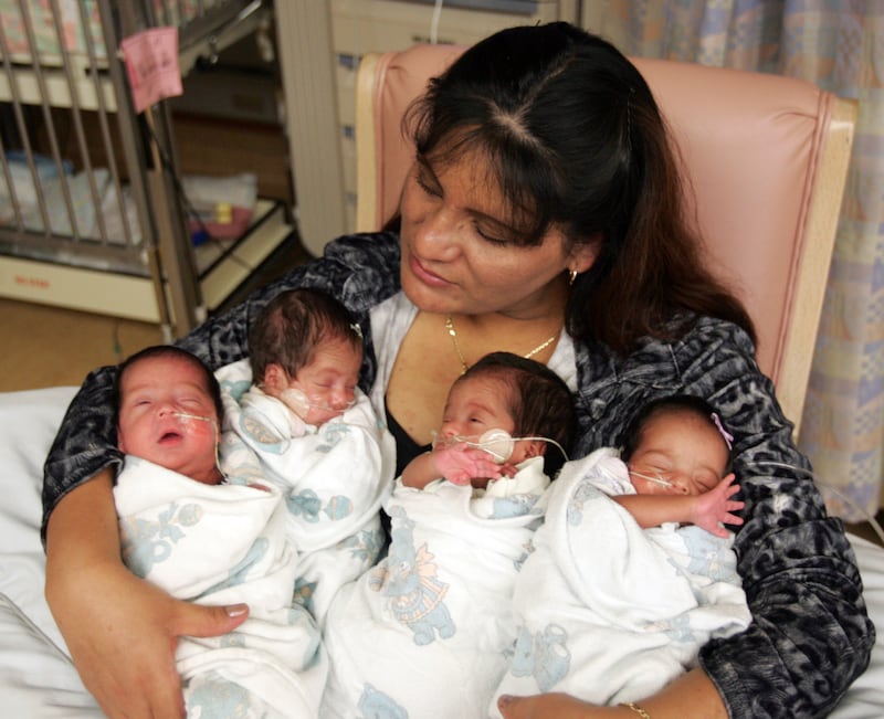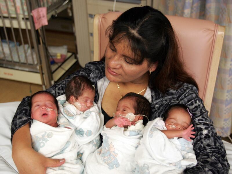 Mirna Tabarez, then 35, and Salvador Ruiz, then 39, had been married for 17 years without getting pregnant when they invested their savings in in vitro fertilization. All three fertilized eggs took, then one split in two. By the time she'd been pregnant six weeks, Tabarez knew she was expecting quads and was soon put on bed rest. Carrying quadruplets is arduous and risky.