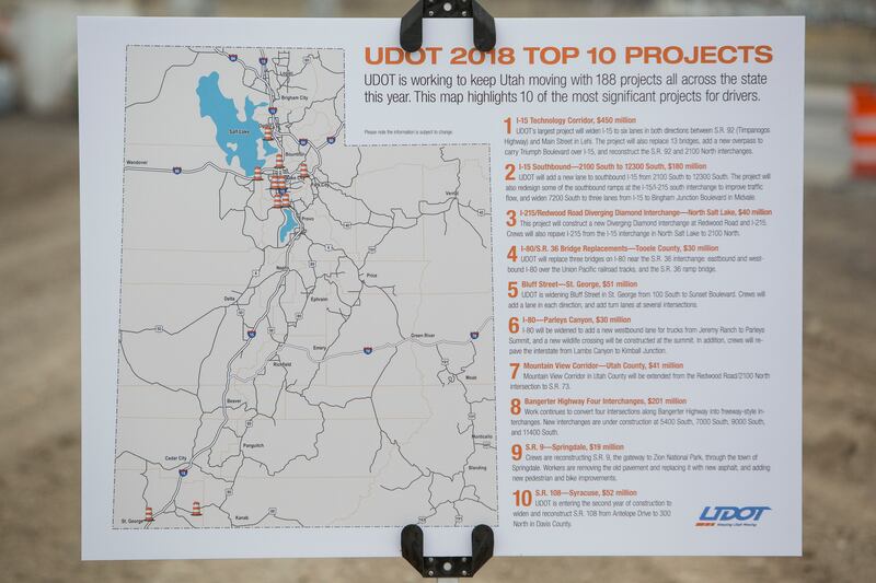 SALT LAKE CITY — The stretch of I-15 now being called the state's "Technology Corridor" ranks No. 1 on the Utah Department of Transportation's Top 10 list of construction projects for 2018.